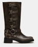 The ROCKY BROWN DISTRESSED WIDE CALF knee boot features the wide profile of an engineer boot with harness and buckle hardware adding an industrial edge and giving the design an adjustable fit.