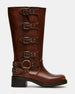 The ROCKY COGNAC DISTRESSED WIDE CALF knee boot features the wide profile of an engineer boot with harness and buckle hardware adding an industrial edge and giving the design an adjustable fit.
