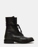 The THERON BLACK DISTRESSED lace-up moto combat ankle boot combines rugged style with durable construction. Designed for reliable wear. this bootie features a distressed finish that adds an edge to any outfit. The secure lace-up design ensures a customized fit. while the sturdy sole offers traction and support suitable for everyday adventures. A perfect choice for those seeking both functionality and bold fashion in a versatile ankle boot.